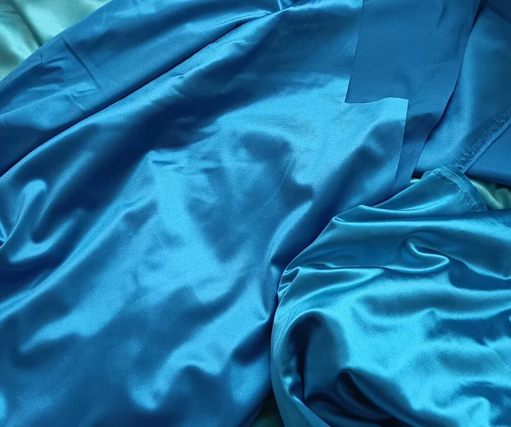 Вельвет сатин голубого цвета, подходит под ярко голубой перл шифон. Глянцевый блеск с одной стороны, ширина 150 см.